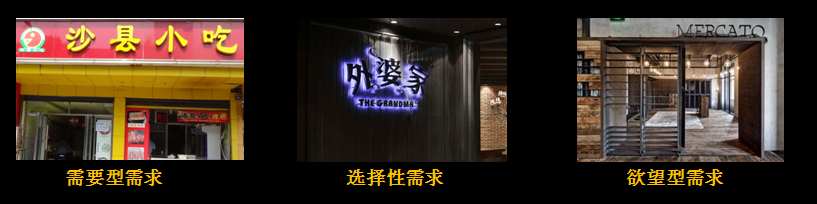 举个栗子:对普通人来讲,肚子饿了,想随便吃点填报肚子,这时满足的是需要型需求,这时候的快餐店、沙县、兰州拉面……。如果讲究点,要下馆子,满足的就是需求,可以去外婆家、新白鹿,绿茶、川味观……如果很讲究,非得去米其林、希尔顿那就是欲望型需求了。