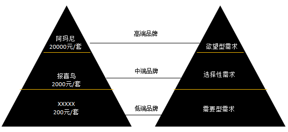 到了专卖店了,有什么利郎啊、红豆啊,报喜鸟啊,要2000块1套了,这些就属于需求型品牌。到了杭州大厦了,一套阿玛尼20000块,这就是欲望型品牌。