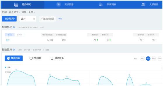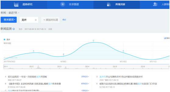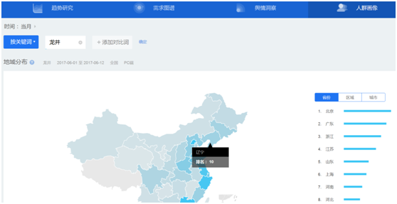 比如:如果想了解龙井茶近期的关注度、关注点及人群基本特性